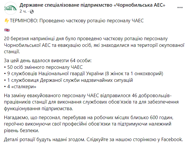 На замену эвакуированного персонала ЧАЭС отправились 46 добровольцев-работников станции для выполнения служебных обязанностей и обеспечения функционирования предприятия. Персонал, который сменили, находился на рабочих местах около 600 часов, героически выполняя свои профессиональные обязанности и поддерживая надлежащий уровень безопасности.