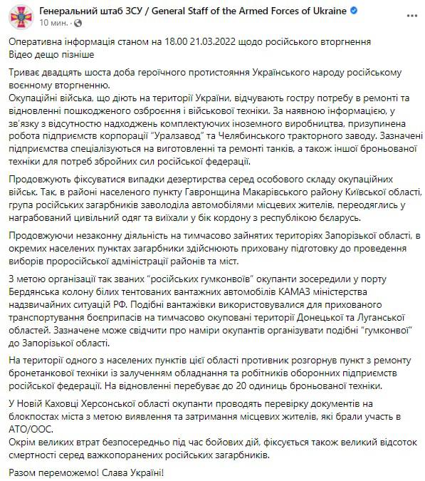 В понедельник, 21 марта, в Украине идет 26-й день войны, которую без объявления начала Россия.