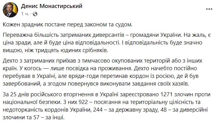 "За 25 дней российского вторжения в Украину зарегистрировано 1271 преступление против национальной безопасности. Из них 922 – посягательства на территориальную целостность и неприкосновенность границ Украины, 244 – за государственную измену, 48 – за диверсионные преступления и 57 – за другие".