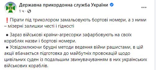12.20 В Госпогранслужбе сообщили, что российские военные закрашивают на своих кораблях названия и бортовые номера, что может означать подготовку к предстоящим провокациям в отношении гражданских судов с последующим обвинением в них украинских военных кораблей.