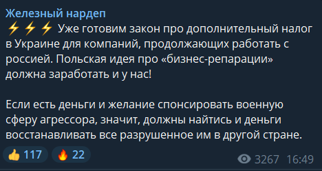 В Украине хотят ввести дополнительный налог на компании, работающие с РФ