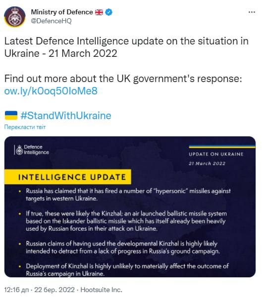 Там полагают, что "РФ, скорее всего, использует "Кинжалы", чтобы отвлечь внимание от отсутствия прогресса в военной кампании "на земле". При этом в британской разведке считают, что "применение "Кинжалов" вряд ли существенно повлияет на ход кампании РФ в Украине".