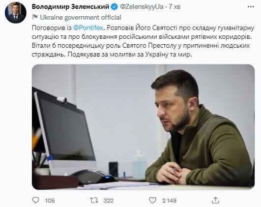 "Рассказал Его Святейшеству о сложной гуманитарной ситуации и о блокировании российскими войсками спасательных коридоров. Приветствовали бы посредническую роль Святого Престола в прекращении человеческих страданий. Поблагодарил за молитвы за Украину и мир", - написал Зеленский в Twitter.
