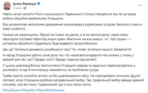 "Не провоцировать Россию" - это распространенный аргумент, когда надо дать России больше пространства для агрессии... Мы, конечно, не желаем никому того горя, с которым столкнулись украинцы из-за войны России. В то же время ошибочно считать, что Венгрия, так же как и любая другая европейская страна, существует в вакууме. Наше государство сейчас фактически защищает восточный рубеж НАТО. Если России удастся достичь ее преступной цели в Украине, следующей целью станут наши соседи. Об этом сейчас открыто говорят российские послы за рубежом… Бесполезно надеяться на то, что попытки задобрить агрессора будут успешными. Это доказывает история, в том числе и самой Венгрии", - заявил представитель министерства иностранных дел Олег Николенко.