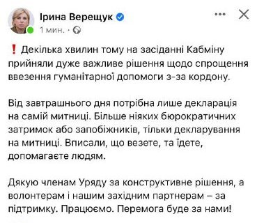 21.50 С завтрашнего дня для ввоза гуманитарки в Украину понадобится только декларация на таможенном пункте. Все остальные бюрократические процедуры отменяются, сообщила вице-премьер Ирина Верещук.