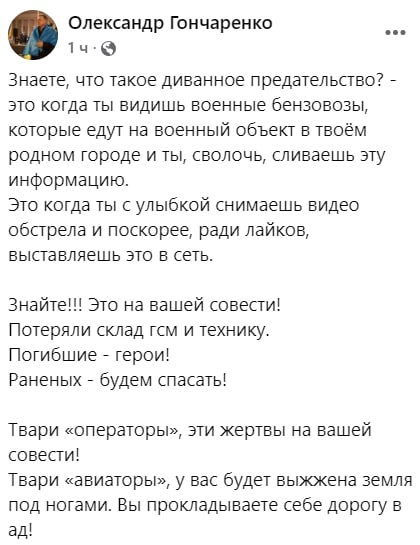 "Знаете, что такое диванное предательство? - это когда ты видишь военные бензовозы, которые едут на военный объект в твоём родном городе и ты, сволочь, сливаешь эту информацию.