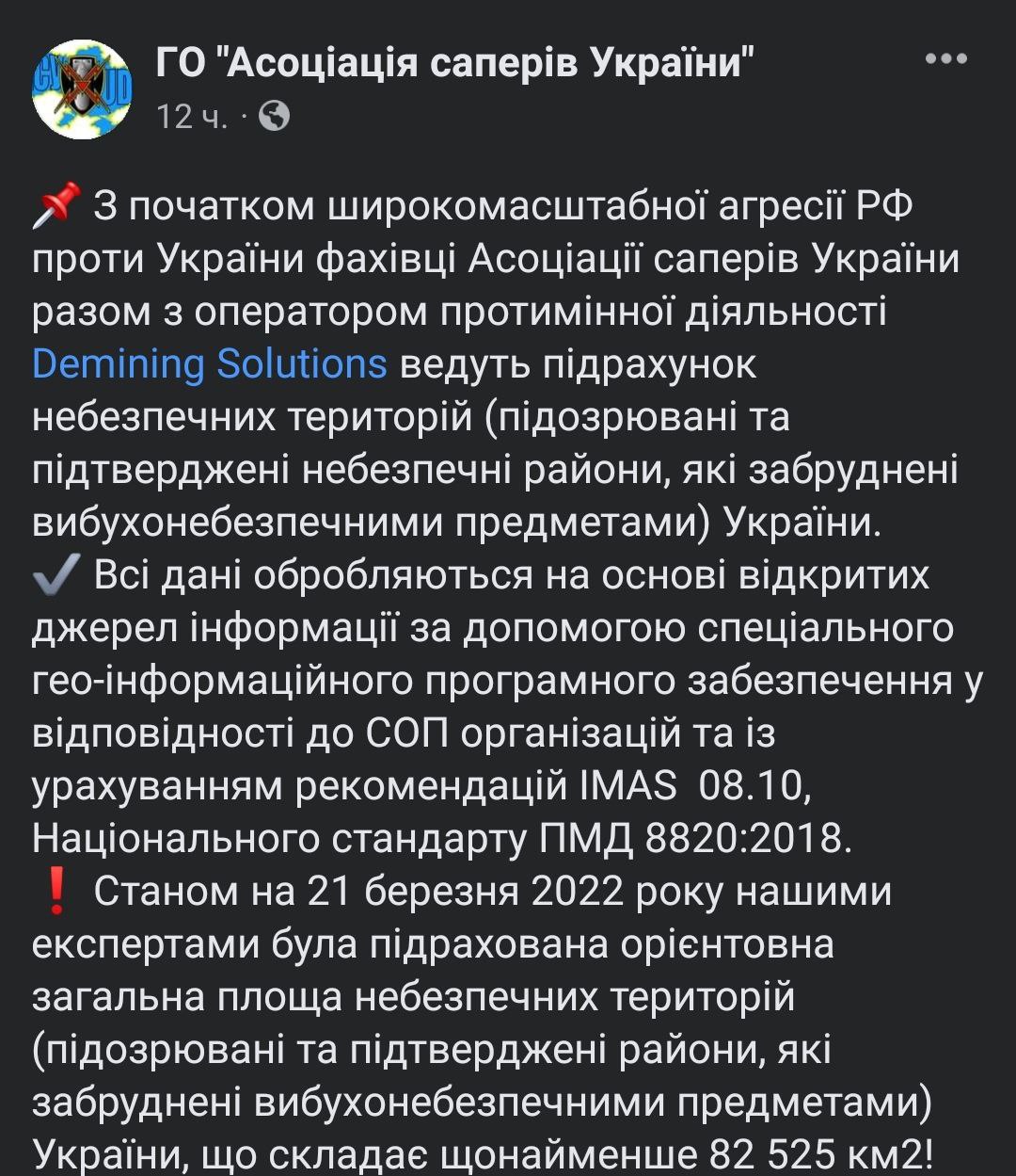 Ассоциация саперов подсчитала, что в Украине, по данным на 21 марта, нужно разминировать примерно одну шестую часть территории - 82,5 тысяч квадратных километров.