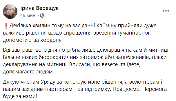 "Несколько минут назад на заседании Кабмина было принято очень важное решение об упрощении ввоза гуманитарной помощи из-за границы. С завтрашнего дня необходима только декларация на самой таможне. Больше никаких бюрократических задержек или предохранителей, только декларирование на таможне. Вписали, что везете и едете, помогаете людям. Спасибо членам правительства за конструктивное решение, а волонтерам и нашим западным партнерам – за поддержку. Работаем. Победа будет за нами!", - написала Верещук.
