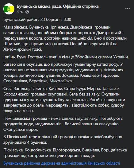 "Оккупатны врываются в дома, ищут пищу и алкоголь, мародерят, отстреливают собак, скот режут на мясо. Немишаевская община - нет света, газа, связи. Нуждаются в продуктах, воде, медикаментах. Большой запрос на эвакуацию. В Песковской территориальной общине в результате авиабомбардировки разрушены 4 дома. Песковская, Коцюбинская, Белогородская, Вишневая, Борщаговская общины под контролем местных органов власти", - добавили в Бучанском горсовете.