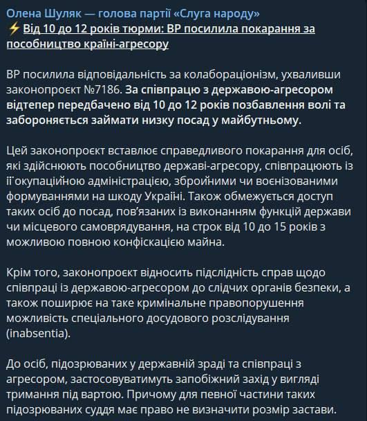 Статья предусматривает наказание за умышленные действия, "направленные на помощь государству-агрессору, его вооруженным формированиям или оккупационной администрации с целью нанесения ущерба Украине".