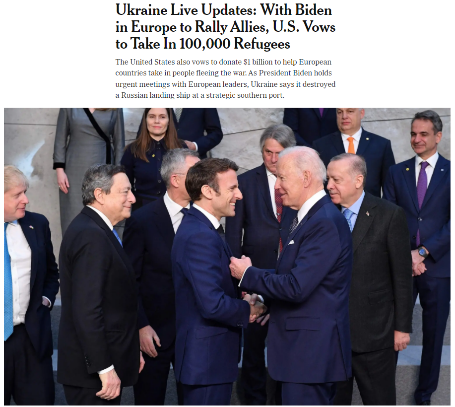 "США обещают принять 100 000 беженцев и пожертвовать 1 миллиард долларов, чтобы помочь европейским странам принять людей, спасающихся от войны. Пока президент Байден проводит срочные встречи с европейскими лидерами, Украина заявляет, что уничтожила российский десантный корабль в стратегическом южном порту", - говорится в сообщении.