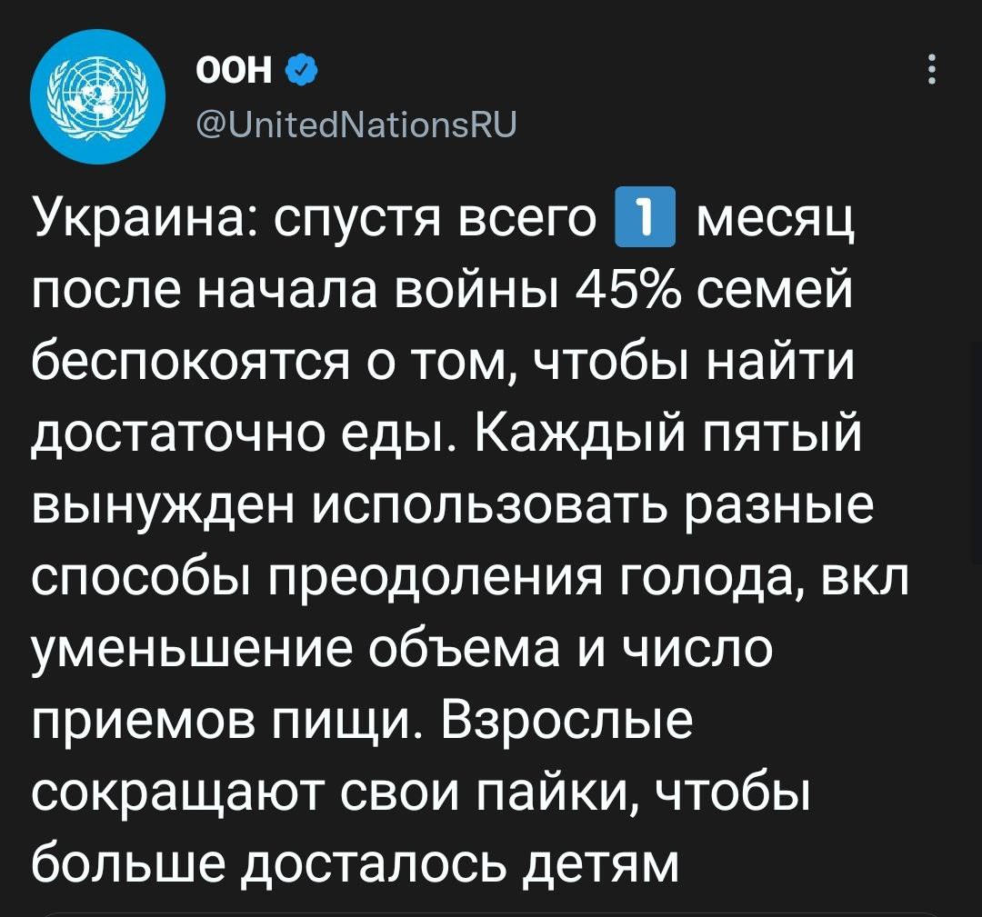 09.20 Спустя месяц после начала войны 45% украинцев начали беспокоиться о нехватке продуктов, сообщает ООН. А каждый пятый украинец уже столкнулся с признаками голода.