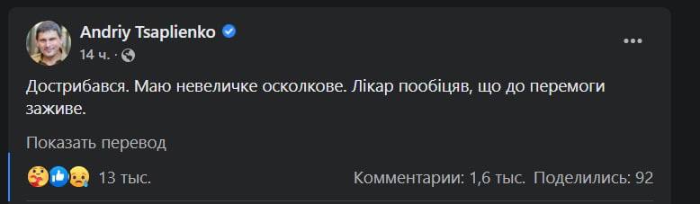 "Врач пообещал, что до победы заживет", - написал Цаплиенко в ФБ.