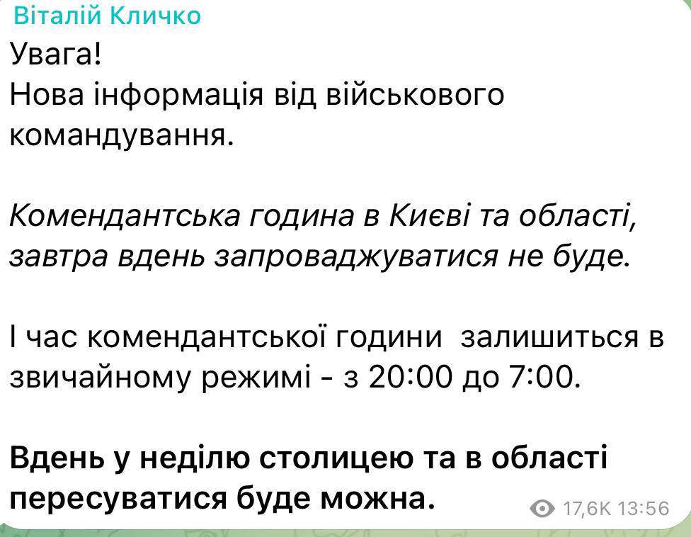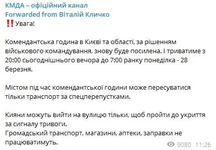 11.37 В Киеве вновь вводится суточный комендантский час - с 20.00 субботы до 7 утра понедельника.