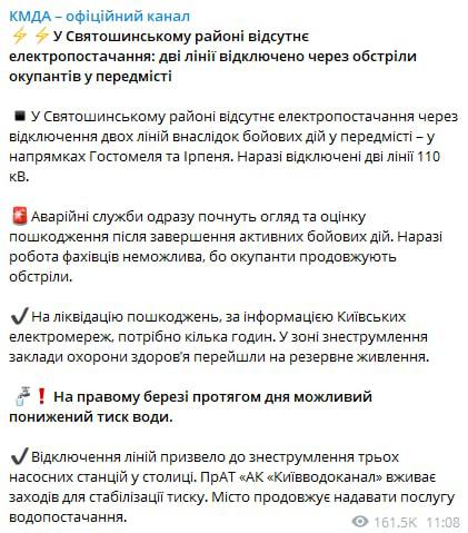 11.40 В Святошинском районе Киева отсутствует электричество - отключены две подающие линии. Причина - "боевые действия в направлении Гостомеля и Ирпеня".
