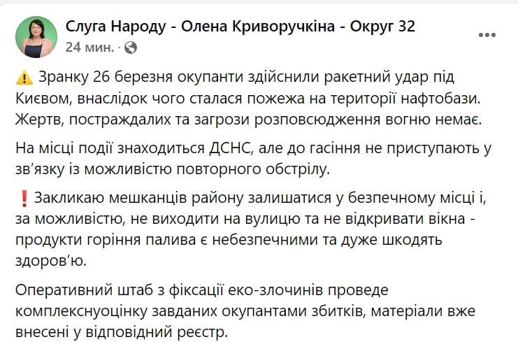 Как сообщила в Facebook народный депутат Елена Криворучкина, утром 26 марта был нанесен ракетный удар по нефтебазе под Киевом.