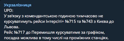 22:40 В результате пожара из-за попадания ракеты в нефтебазу в Дубно ряд пассажирских поездов будут направляться с задержкой на безопасном расстоянии. Это касается прежде поездов Ивано-Франковск – Кременчуг и Львов – Полтава.