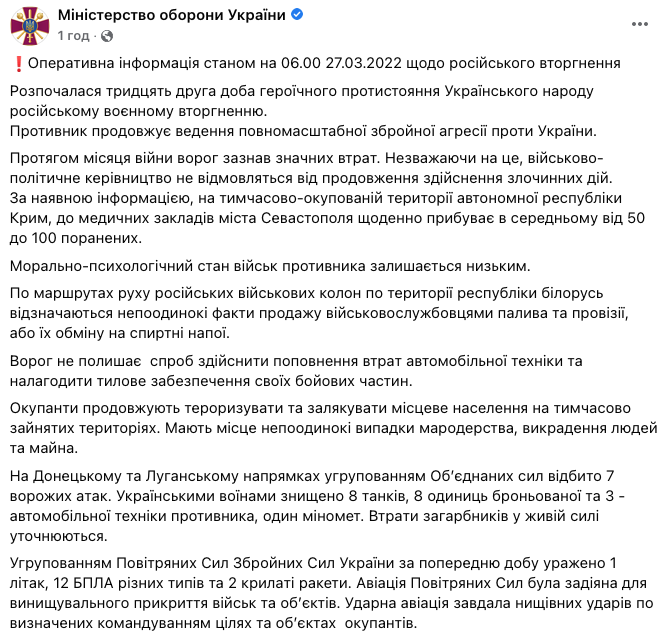 Сегодня, 27 марта, тридцать второй день продолжаются боевые действия в Украине. Читайте в нашем онлайне об обстановке в городах и на фронте.
