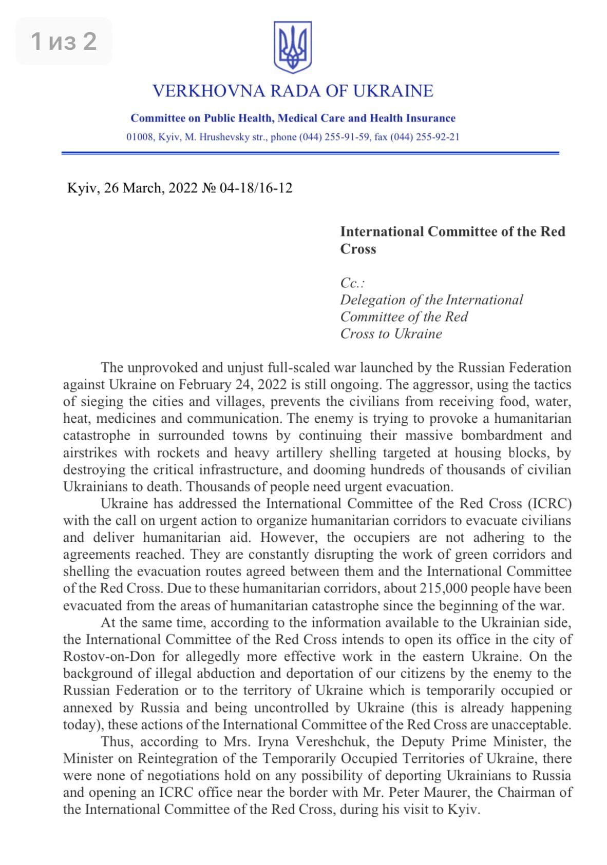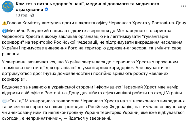 Председатель комитета по здоровью нации, медицинской помощи и медицинского страхования Верховной Рады Михаил Радуцкий обратился к Красному Кресту с призывом не открывать офис в российском городе Ростов-на-Дону.