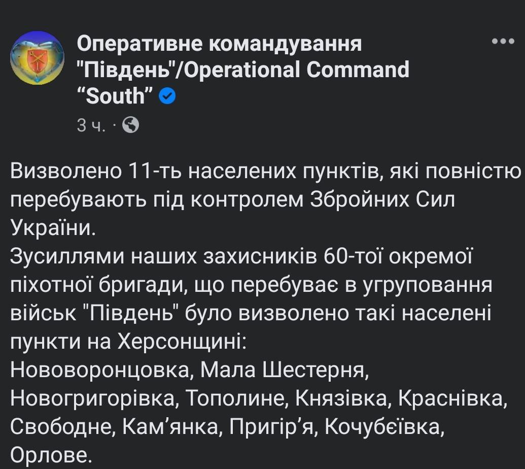 06.01 Оперативное командование "Юг" заявляет, что в Херсонской области освободило 11 населенных пунктов: