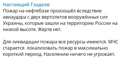 07.33 Нефтебазу в Белгороде разбомбили два украинских вертолета, которые шли на низкой высоте. Об этом сообщил губернатор Белгородской области Гладков.