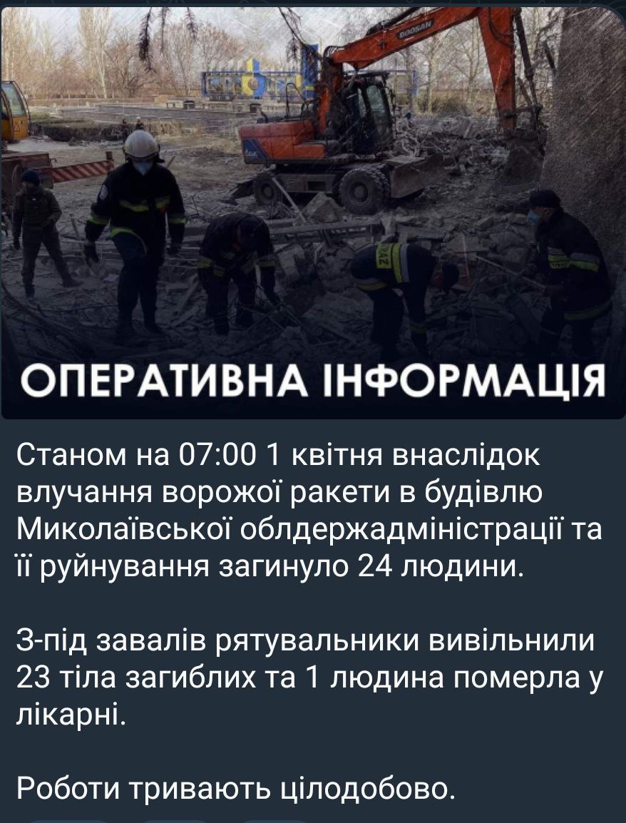 10.24 Число погибших в результате ракетного удара по Николаевской ОГА увеличилось до 27 человек. Еще сегодня утром в ГосЧС сообщали о 24 погибших.