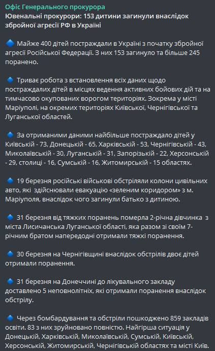 09.20 С начала вторжения России в Украину в результате боевых действий погибли 153 ребенка, по меньшей мере 245 ранены. Об этом говорится в сообщении Офиса генпрокурора в Telegram.