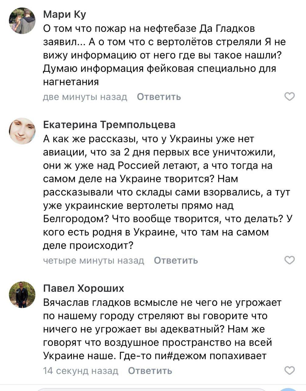 "Вячеслав Гладков, в смысле ничего не угрожает? По нашему городу стреляют, вы говорите, что ничего не угрожает, вы адекватный? Нам же говорят, что воздушное пространство Украины наше. Где пи@дежом попахивает", - пишет один из пользователей соцсети.