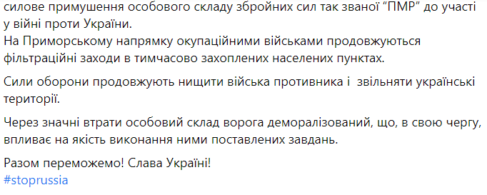 "На Приморском направлении оккупационными войсками продолжаются фильтрационные меры во временно захваченных населенных пунктах. Силы обороны продолжают уничтожать войска противника и освобождать украинские территории. Из-за значительных потерь личный состав врага деморализован, что, в свою очередь, влияет на качество выполнения ими поставленных задач", - добавили в Генштабе.