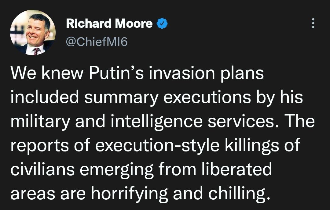 "Мы знали, что планы Путина по вторжению включали внесудебные казни его военными и разведывательными службами. Сообщения об убийствах в стиле казни мирных жителей из освобожденных районов вызывают ужас и леденят кровь", - заявил глава британской разведки Ми-6.
