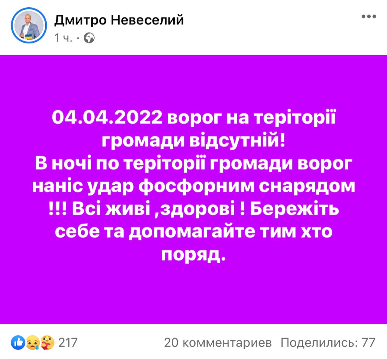 "Ночью по территории громады враг нанес удар фосфорным снарядом!!! Все живы и здоровы", - говорится в сообщении.