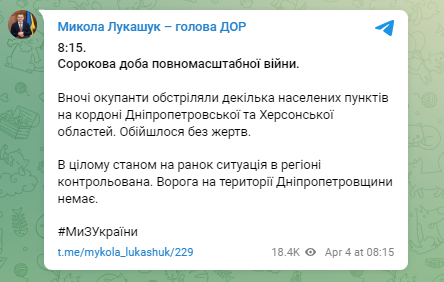 "В целом по утрам ситуация в регионе контролируется. Врага на территории Днепропетровской области нет", - добавил Лукашук.
