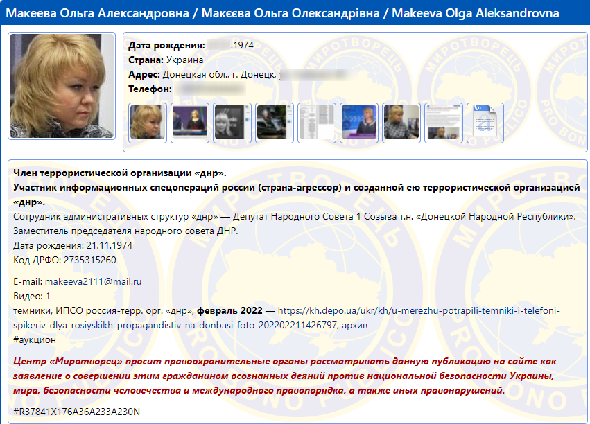 С ноября 2014 года Макеева внесена в списки сайта "Миротворец" как "член террористической организации "ДНР".