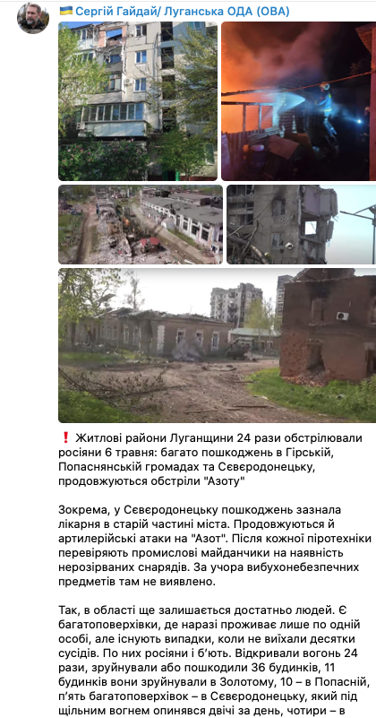 Также Гайдай сообщает, что в целом в Северодонецке обстреливаются жилые кварталы, зафиксировано много разрушений в жилом фонде и повреждена больница в старой части города.