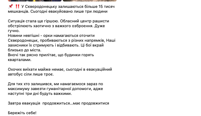 При этом в Северодонецке остается более 15 тысяч жителей, и люди почти перестали эвакуироваться. Вчера выехало всего три человека.