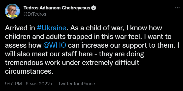 "Прибыл в Украину. Будучи ребенком войны, я знаю, что чувствуют дети и взрослые, оказавшиеся в ловушке этой войны. Я хочу оценить, как ВОЗ может увеличить нашу поддержку им", - отметил Гебрейесус.