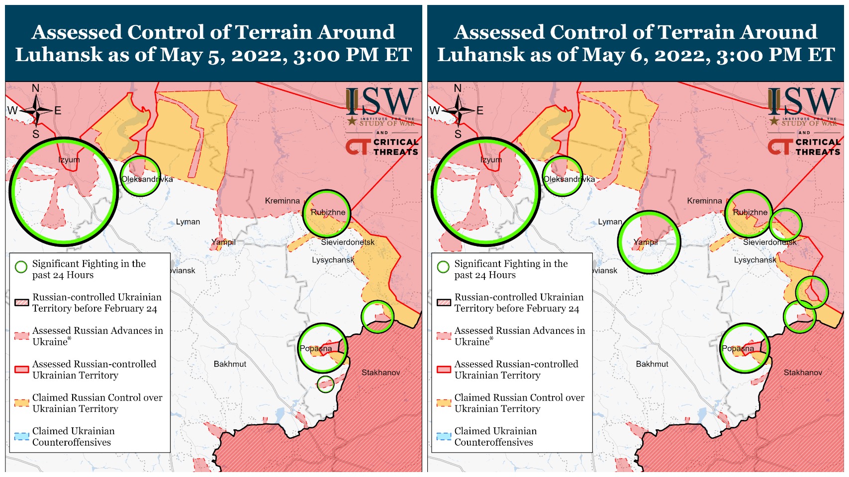 Также по картам заметно, что российские войска существенно расширили зону контроля к северо-востоку от Ямполя. А также к югу от Изюма и продвинулись в Рубежном.