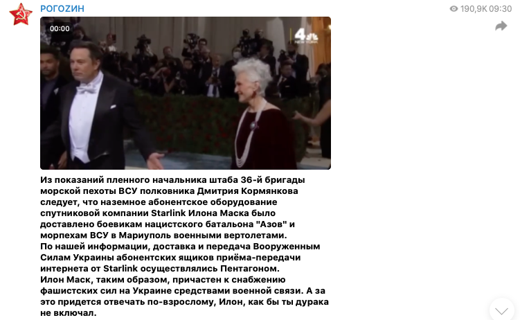 Он ссылается на показания пленного начальника штаба 36-й бригады морской пехоты ВСУ полковника Дмитрия Кормянкова, который якобы сообщил, что наземное абонентское оборудование спутниковой компании Starlink Илона Маска было доставлено военными "Азова" и морпехами ВСУ в Мариуполь военными вертолетами.