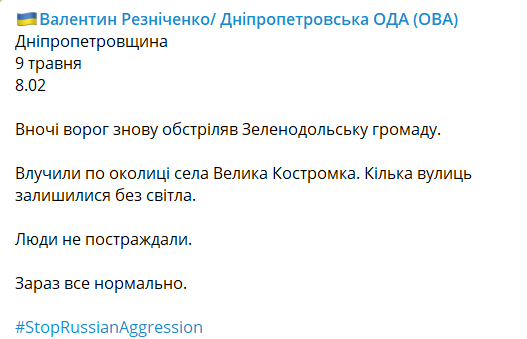 В ночь с 8 на 9 мая российские войска обстреляли Зеленодольскую громаду (Днепропетровская область).
