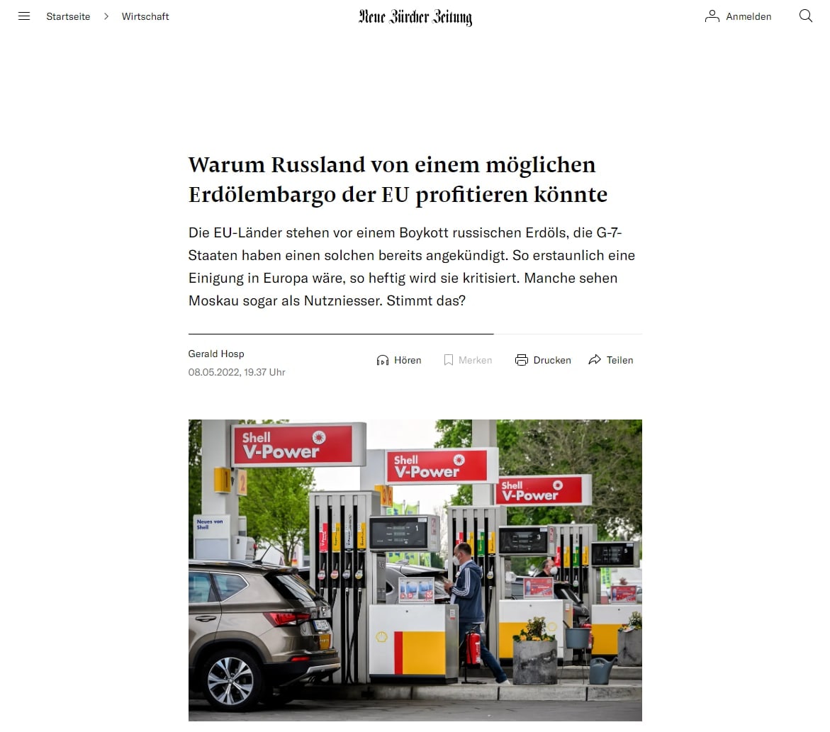 Москва может выиграть от нефтяного эмбарго ЕС из-за роста цен и поэтапного введения санкций. Об этом пишет экономический обозреватель швейцарской газеты Neue Zürcher Zeitung Геральд Хосп.