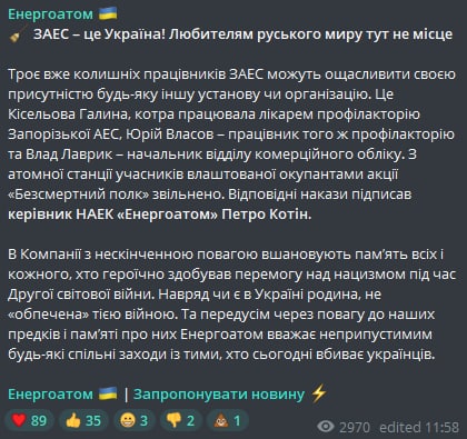 "Три уже бывших работника ЗАЭС могут осчастливить своим присутствием любое другое учреждение или организацию. Это Киселева Галина, работавшая врачом профилактория Запорожской АЭС, Юрий Власов – работник того же профилактория и Влад Лаврик – начальник отдела коммерческого учета. С атомной станции участники устроенной оккупантами акции "Бессмертный полк" уволены. Соответствующие приказы подписал руководитель НАЭК "Энергоатом" Петр Котин", - говорится в сообщении.