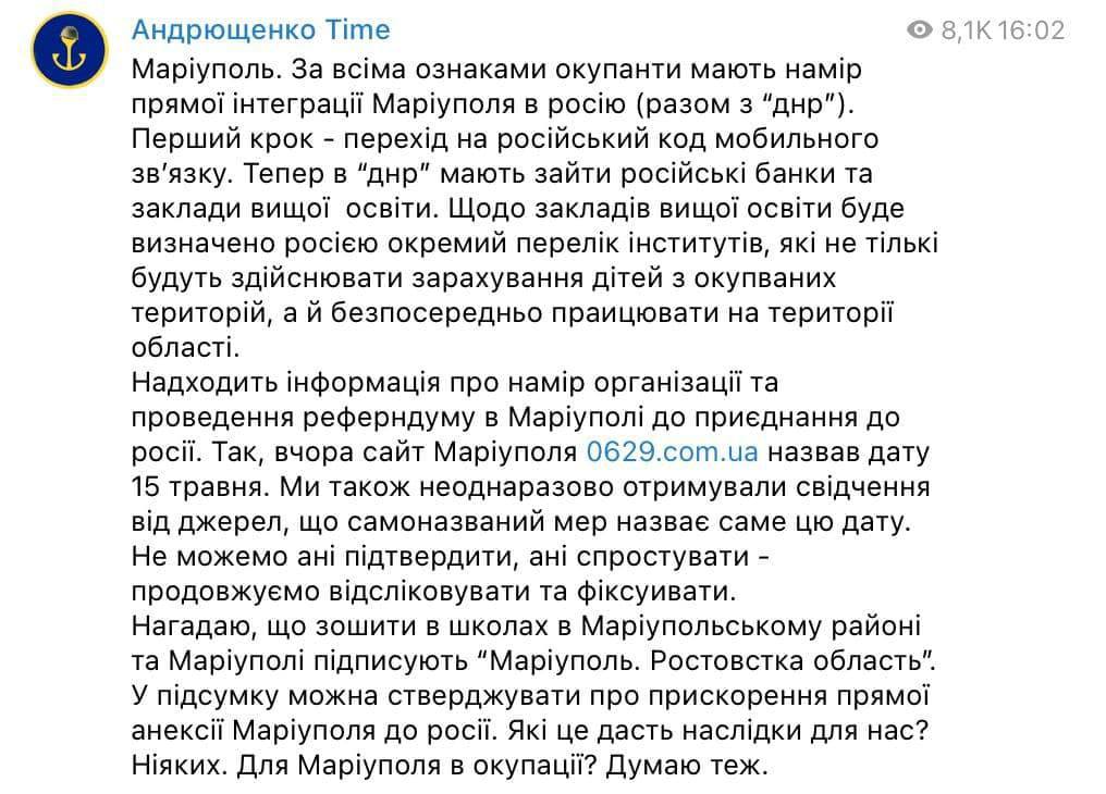 Россия намерена присоединить Мариуполь к России вместе с "ДНР". На местных сайтах даже утверждают, что "референдум" о входе в состав РФ может состояться уже через несколько дней.