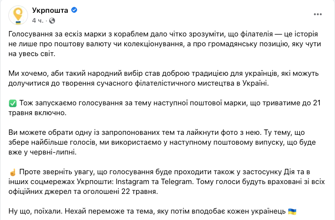 Голосование продлится до 21 мая. Свой голос можно отдать через "Дию" и лайком в социальных сетях "Укрпочты".