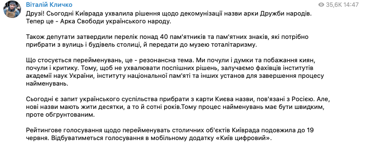 "Сегодня есть запрос украинского общества убрать с карты Киева названия, связанные с Россией. Но новые названия должны жить десятки, а то и сотни лет. Поэтому процесс наименований должен быть быстрым, однако обоснованным", - пишет Кличко.
