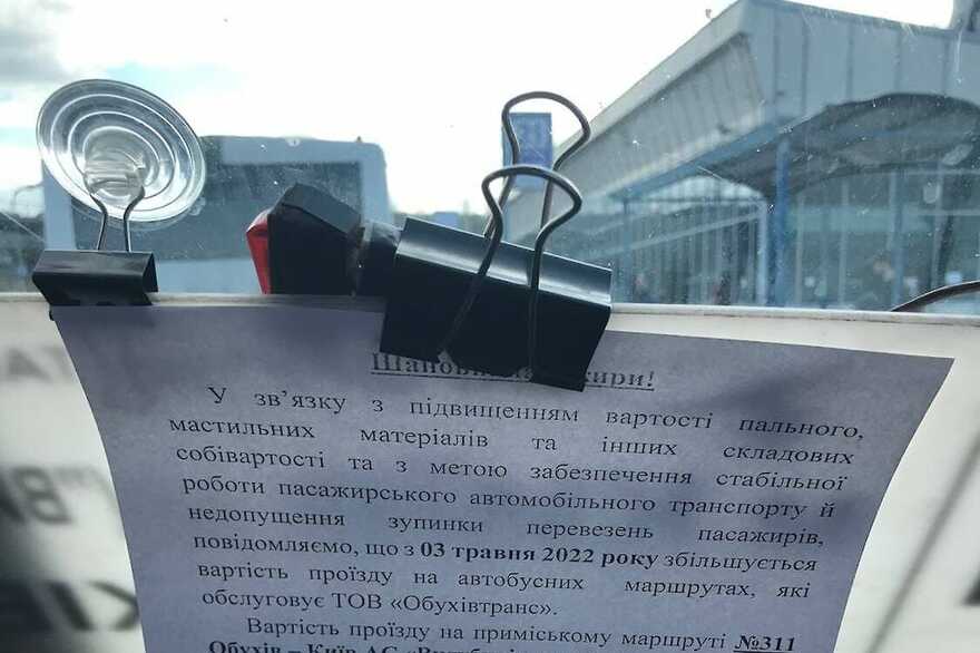Подорожал проезд и на других областных маршрутах. Так, еще в начале мая тариф в маршрутке, которая перевозит пассажиров из Обухова до станции Выдубичи в Киеве, подняли до 45 грн (был 38 грн). Повышение цены объяснили подорожанием топлива.