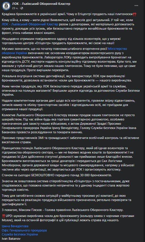 "Львовский оборонный кластер" сообщил, что в сети продают бронежилеты, похожие на те, которые производит ЛОК (Минобороны определило ЛОК основным координатором волонтерского движения по производству бронежилетов).