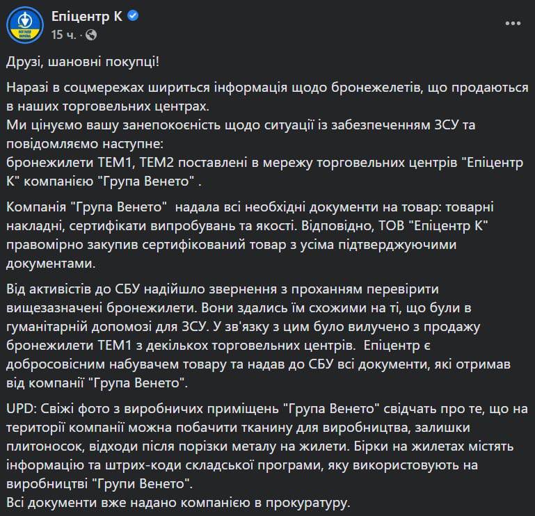 Также в "Эпицентре" заявили о снятии с продажи бронежилетов из нескольких торговых центров для проверки СБУ.