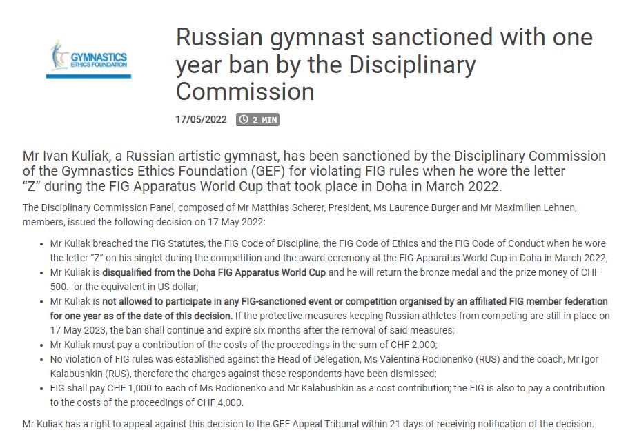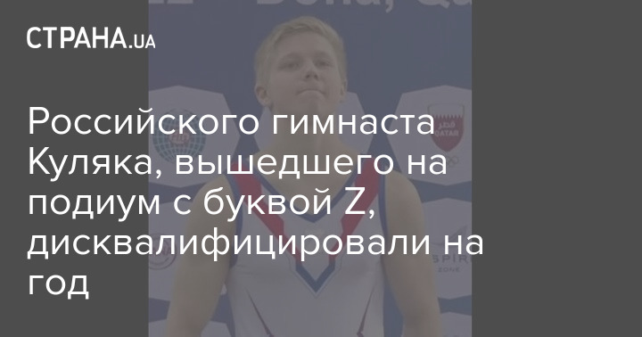 Дисциплинарная комиссия Международной федерации гимнастики (FIG) дисквалифицировала на год российского гимнаста Ивана Куляка за демонстрацию буквы "Z" во время церемонии награждения на этапе Кубка мира в Дохе.