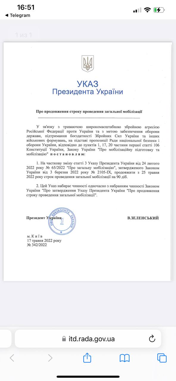 Всеобщую мобилизацию в Украине также продлили на 90 дней.