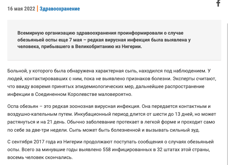 Всемирная организация здравоохранения держит на контроле вспышку обьезьяней оспы в Европе. Организация была проинформирована о первом случае заражения в Великобритании еще 7 мая.